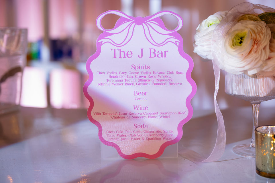 For this ultra-feminine and fashion-forward Bat Mitzvah, Amanda Ashley Designs crafted a sleek suite of custom graphics centered around a soft pink palette and oversized bows. From the refined logo and clean menu designs to the bold dance floor and cohesive branding throughout, every detail was thoughtfully designed to elevate the theme. The event was impeccably planned by Hayley, who brought the vision to life with dramatic florals and statement-making bow installations. Together, the modern graphics and impactful décor created a celebration that was both elegant and unforgettable.